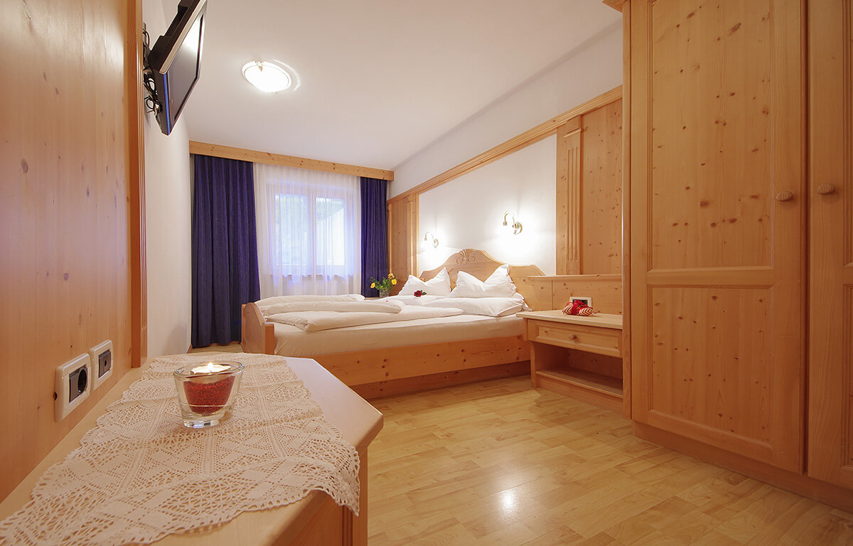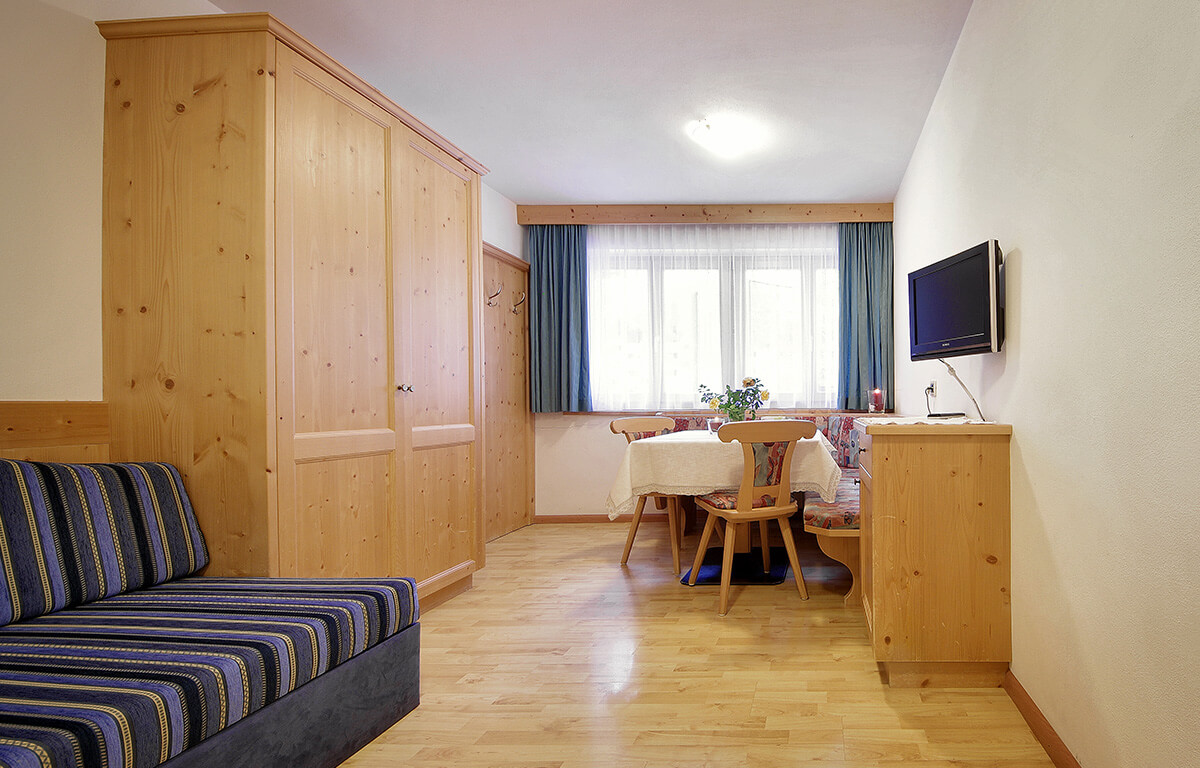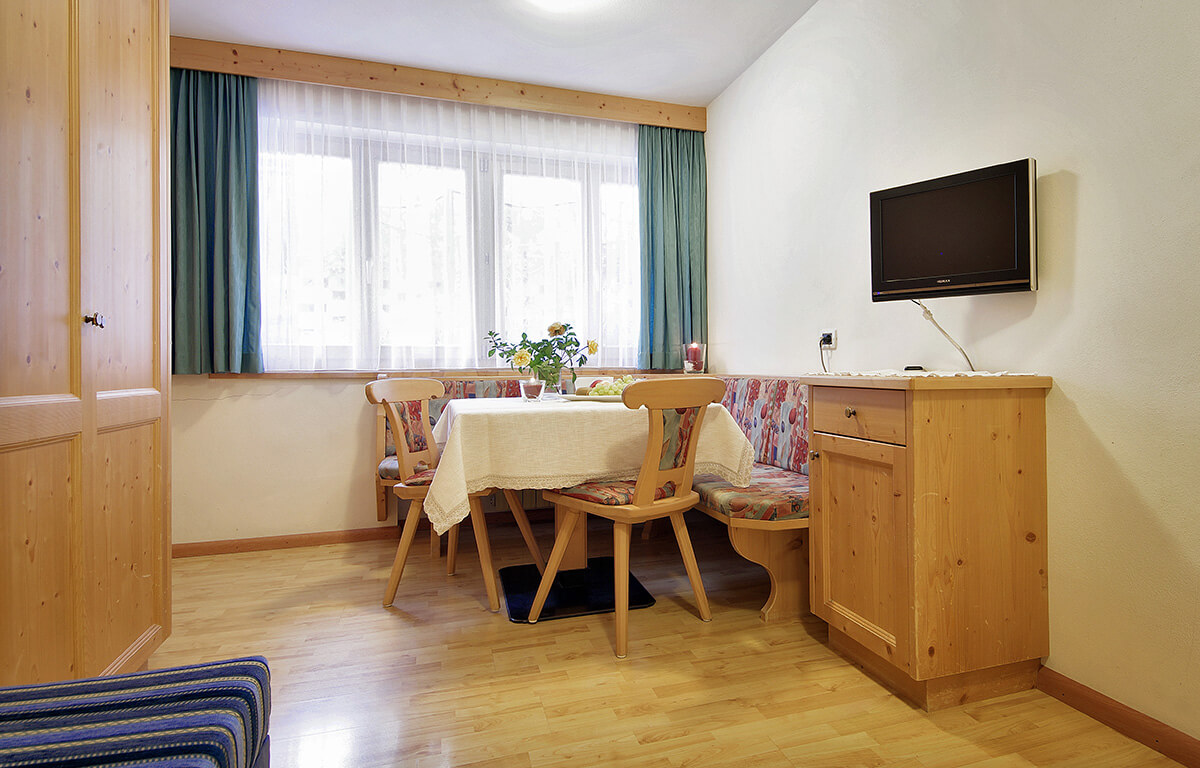 Questo appartamento si trova al primo piano, rivolto a nord e dispone di un corridoio all’entrata, bagno con doccia e asciugamani, una camera con letto matrimoniale e di un salotto con cucina abitabile, tavolo da pranzo e divano-letto che può ospitare due persone. L’arredamento è in stile tirolese moderno ed il pavimento in comodo parquet.
